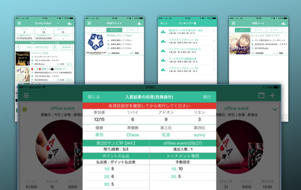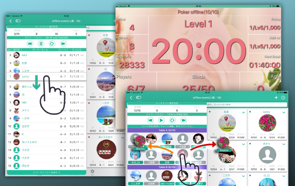 Run synchro timer on any device. Operations such as changing seats and eliminating players can be easily handled.